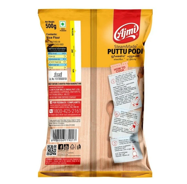 Top quality rice flour perfectly ground and hygienically packed to make a whole range of delectable delicacies. Use midly warm water with salt added to taste, and throughly knead Ajmi Steam MadeTM Puttu Podi till all of it is evenly moist. Set aside for 15 minutes for the mixture to become soft.