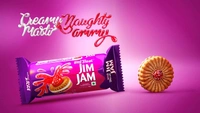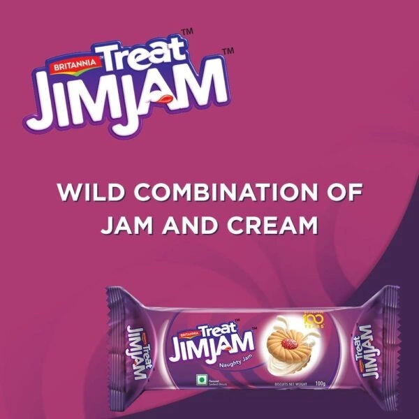 Jimmy and Jammy come together to give you a twin Treat of Masti Cream and Naughty Jam in a pack of Treat Jim Jam. The combo of thick vanilla or cunning chocolate cream sandwiched between crisp biscuits, topped with a dollop of Jam and sugar crystals, makes Jim Jam the king of the Treat range.
