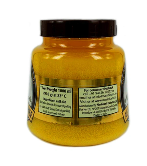Nambisan's Ghee is made by melting pure Butter. Its rich taste, flavor, wafting aroma and purity is unmatched in the realm of dairy produce. ... Nambisan's is a perfect blend of tradition and modern techniques in every way and delivers the best in every pack Nambisan's ghee has multiple uses in every home.Quality is also good. Packaging is great. Overall this product is awesome in taste, thickness etc and this brand is more than 50 years old so we can trust it.