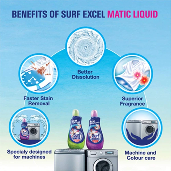 - Faster Stain Removal in Machines - New Surf excel matic liquid detergent with a powerful cleaning technology penetrates stains faster and removes tough stains in machines itself